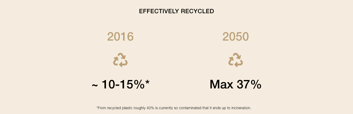 Helaas komt het meeste in de natuur terecht of wordt het verbrand. Zelfs in de meest optimistische scenario's zal tegen 2050 slechts 37% van de plastic verpakkingen worden gerecycled. Gelukkig zijn er nieuwe materiaalopties beschikbaar die ook gerecycled materiaal kunnen gebruiken.